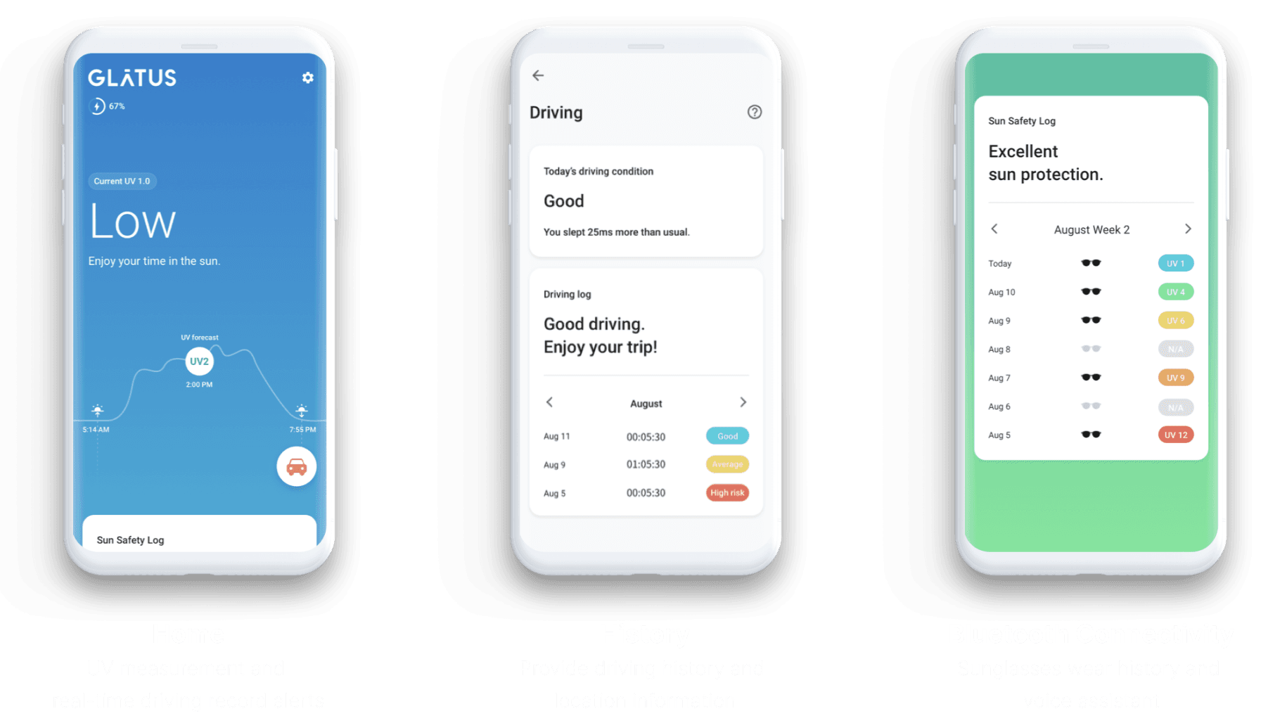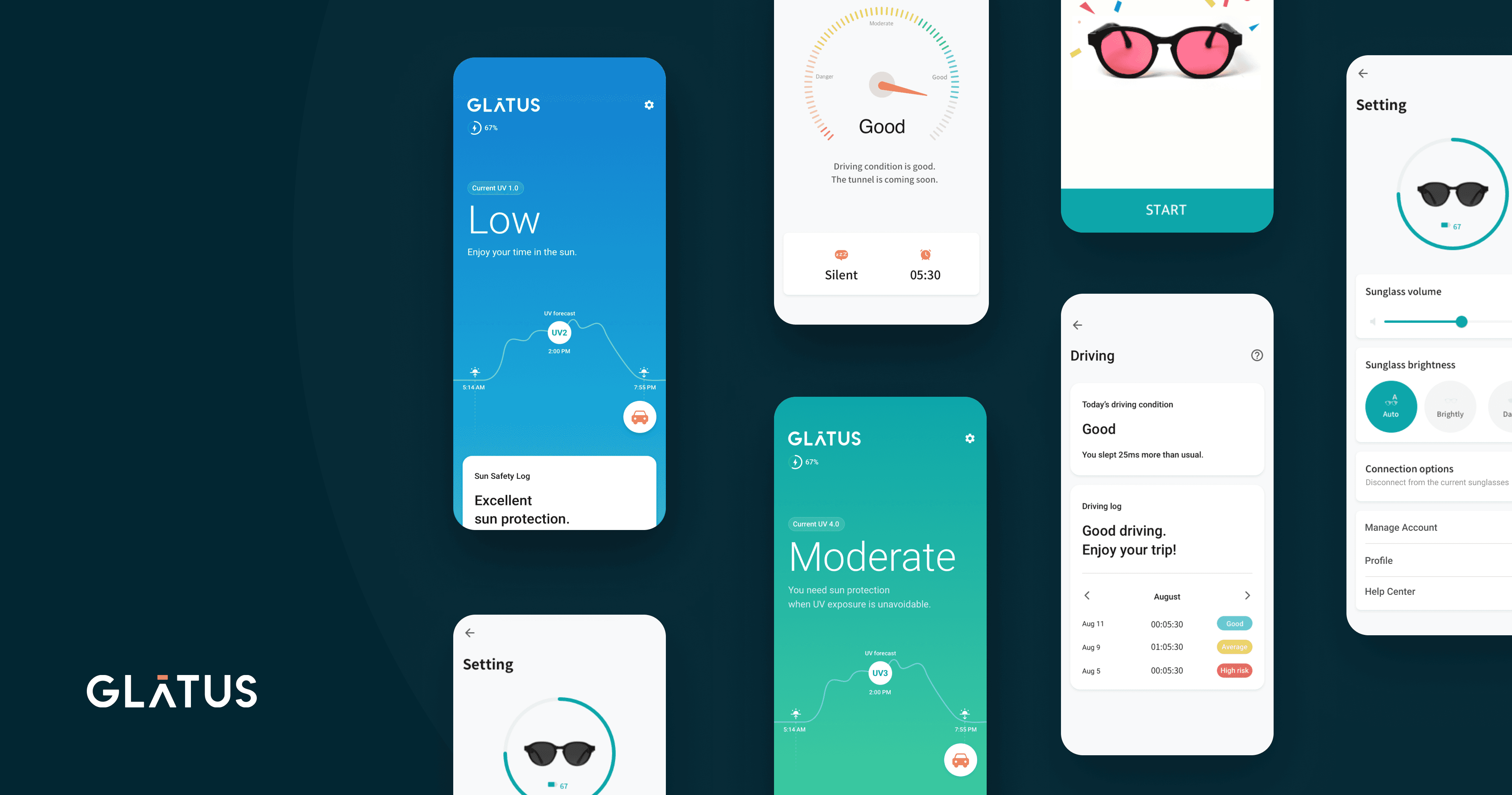 Glatus is designed to enhance daily experiences by measuring the UV index and providing UV and Lifestyle Indexes, along with usage tracking. It ensures safer driving with audio alerts designed to prevent drowsiness. The user interface, vibrant yet minimalist and casual, features a dynamic pastel palette that changes according to UV exposure and driving conditions, prioritizing clear usage tracking even on the move.