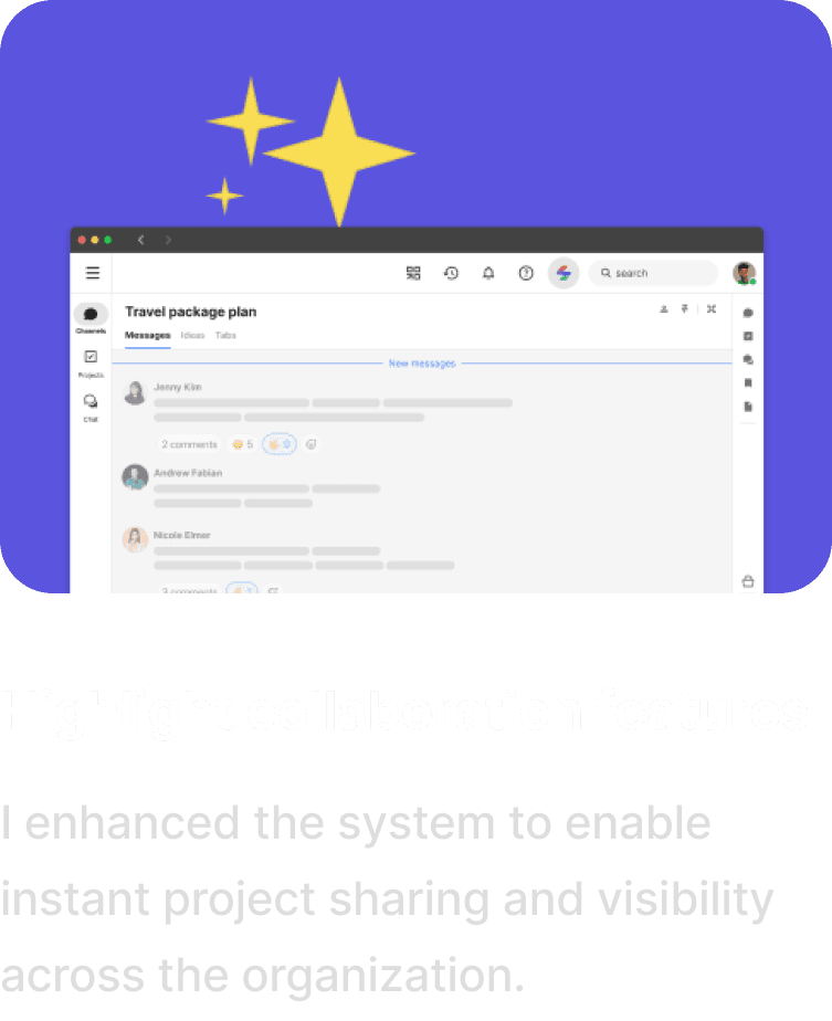 This enables more efficient collaboration than traditional methods. As part of a major overhaul to Swit 2.0, I improved the extended work experience for several organizations.