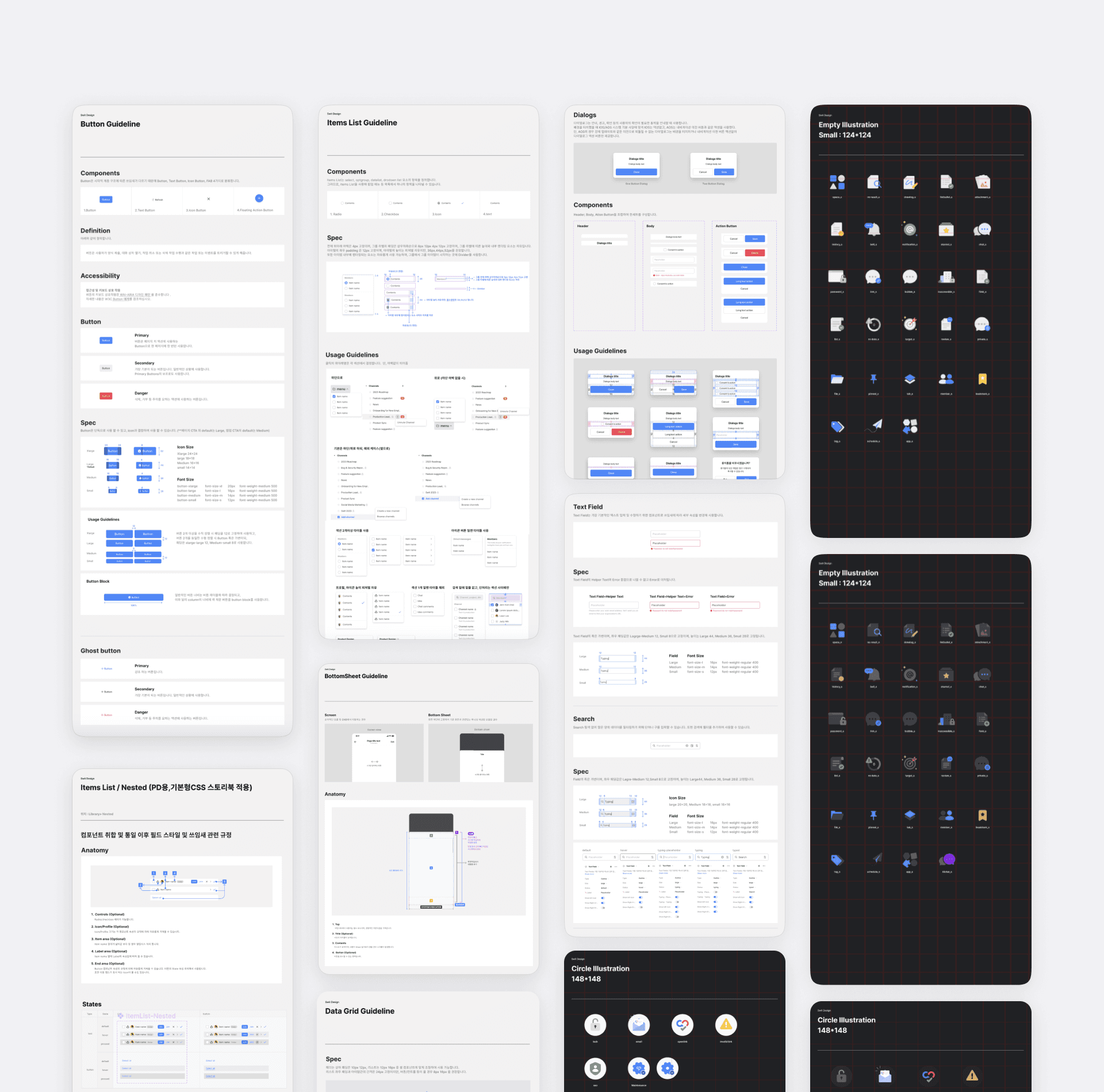 The task cards also had inconsistent elements, such as text fields and layer forms that appeared with the add button, which all had different designs. This inconsistency caused significant issues with quickly entering task information and reduced the readability needed for efficient project management. To improve Swit 2.0, we collaboratively developed a comprehensive design system to address these inconsistencies and enhance the overall user experience.